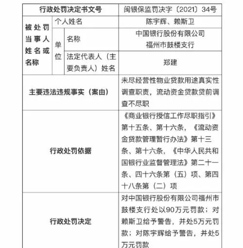 另根据闽银保监罚决字〔2021〕34号行政处罚决定书,中国银行股份有限公司福州市鼓楼支行因未尽经营性物业贷款用途真实性调查职责,流动资金贷款贷前调查不尽职,中国银保监会福建监管局对该支行处以90万元罚款;并对两位相关人员给予警告,并分别处5万元罚款。