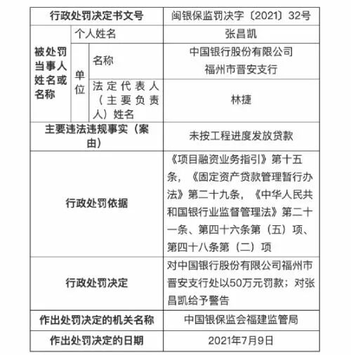 据银保监会福建监管局披露的闽银保监罚决字〔2021〕32号行政处罚决定书显示,中国银行股份有限公司福州市晋安支行因未按工程进度发放贷款,福建监管局对其处以50万元罚款;对相关人员给予警告处分。