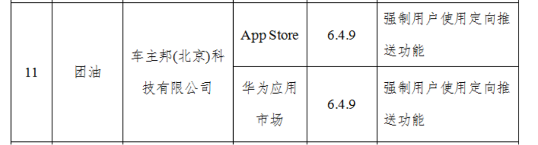 据悉,本次团油APP未完成整改内容为强制用户使用定向推送功能,应用开发者为车主邦(北京)科技有限公司(下称“车主邦”),应用来源于App Store以及华为应用市场,应用版本均为6.4.9。