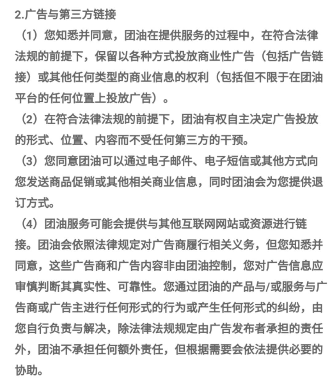 用户协议还显示,团油服务可能会提供与其他互联网网站或资源进行链接。用户通过团油的产品与/或服务与广告商或广告主产生纠纷,将由用户自行负责与解决,除法律法规规定由广告发布者承担的责任外,团油不承担任何额外责任。