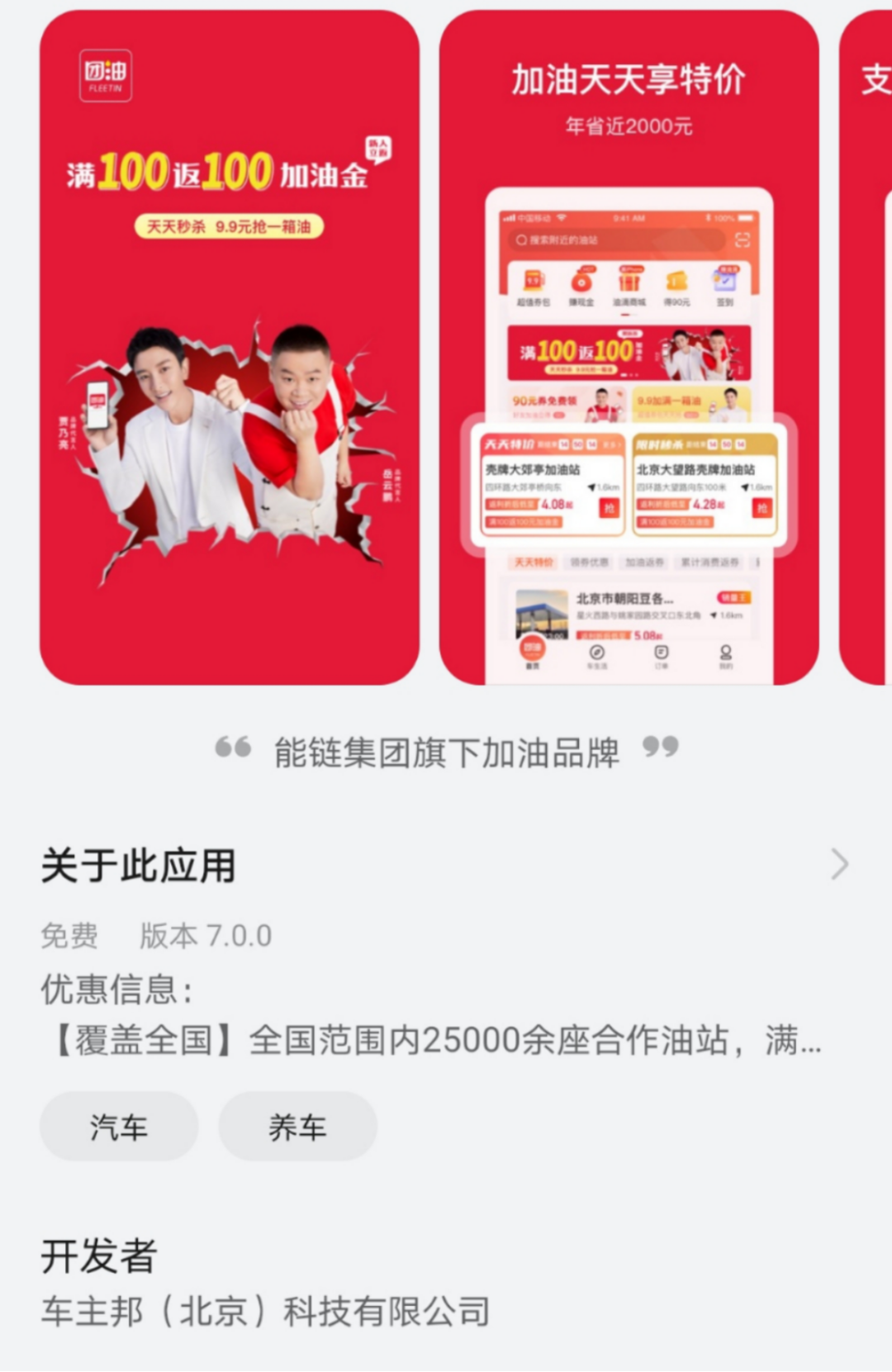应用信息显示,团游APP为能链集团旗下加油品牌,能链集团成立于2016年,集团创始人与法定代表人为戴震,是能源新零售平台,旗下有团油、快电、能链云等。团油APP开发者为车主邦(北京)科技有限公司,天眼查显示,车主邦成立于2016年,持有“团油”相关产品信息和商标信息。