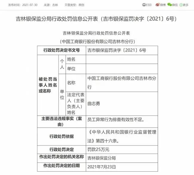 员工异常行为排查有效性不足,工商银行被处罚 小百 • 2021-08-02 支付图文 根据银保监会网站7月30日信息,吉林银保监分局作出行政处罚决定:对中国工商银行吉林市分行罚款25万元,对李岩警告。 主要违法违规事实(案由):员工异常行为排查有效性不足。 合作/客服微信:baike2999 ▼进群加微信:baike2888 点击下方卡片关注支付百科 编辑:小百,转载请注明出处:https://www.paybaike.com/?p=4861 0 扫一扫,分享到微信 猜你喜欢 未央今日播报:“固收+”基金迎监管新规范 支付宝公布小微商家降费进展 移动支付干掉线下终端,ATM龙头转型难 第三方支付应用分析:政务服务