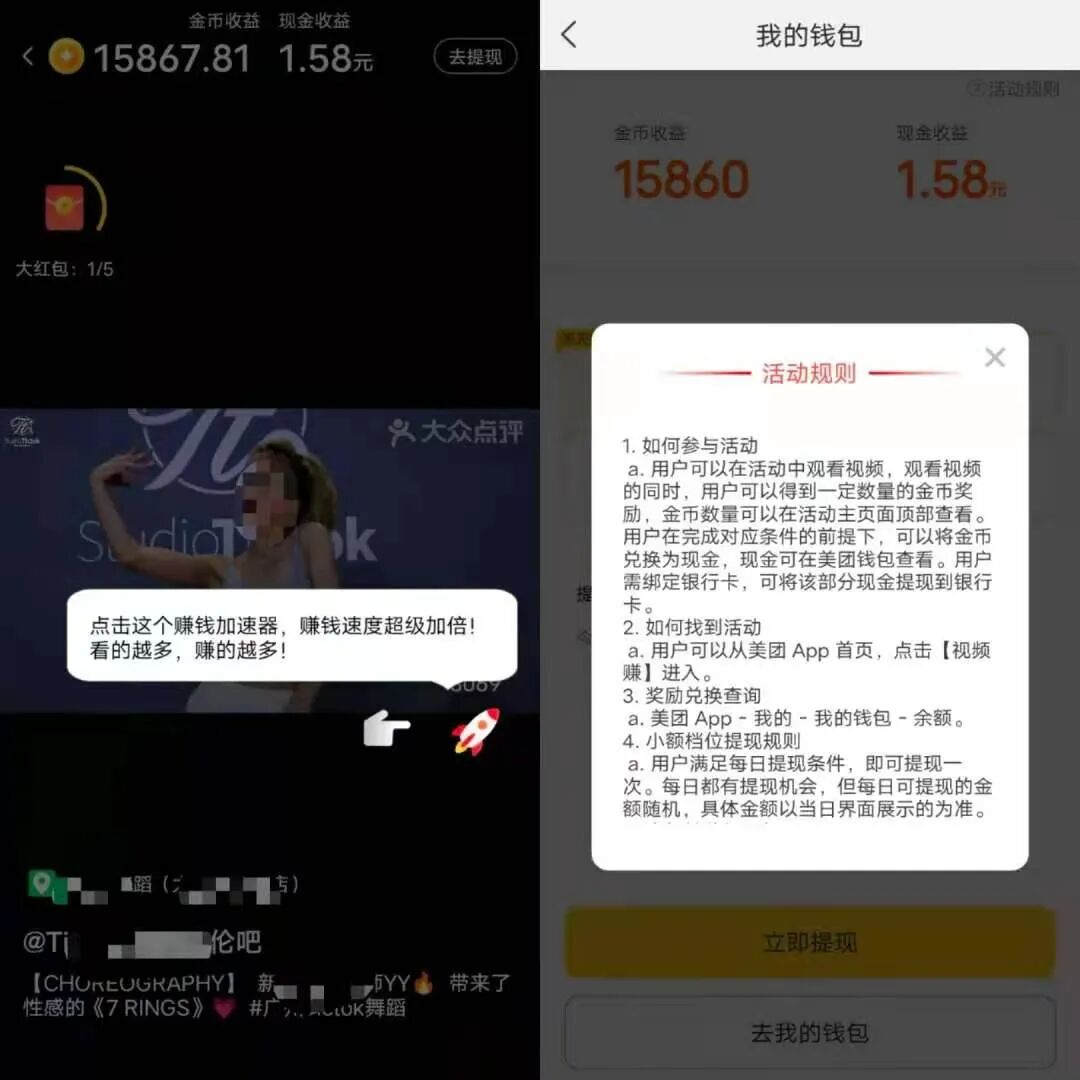 据Tech星球消息,美团开始内测“短视频”入口,取名为“看视频赚钱”或“视频赚”。用户在观看视频的同时可以获得一定数量的金币奖励,达到一定条件还可兑换现金。这一模式与极速版抖音、快手极为相似。