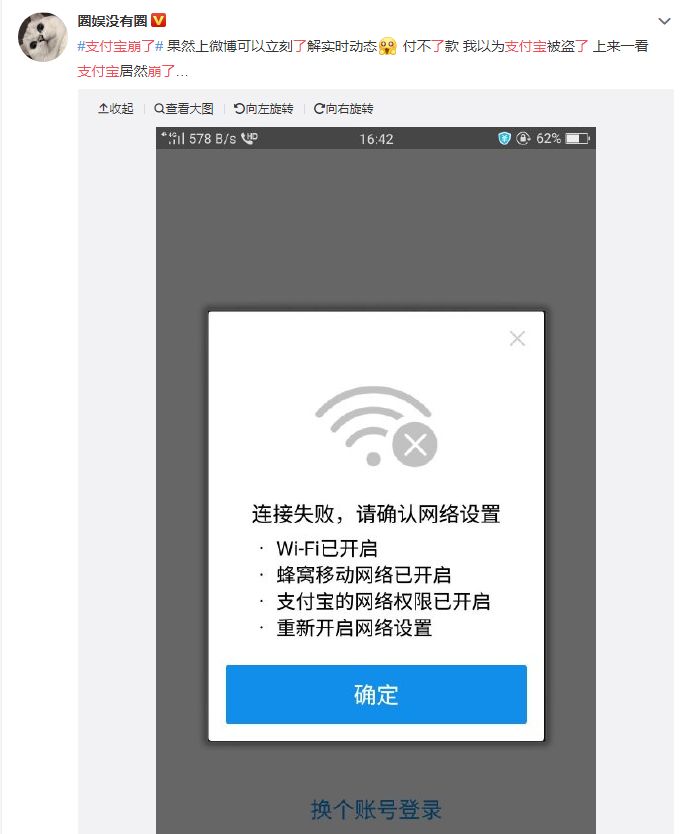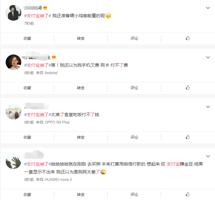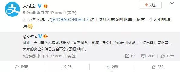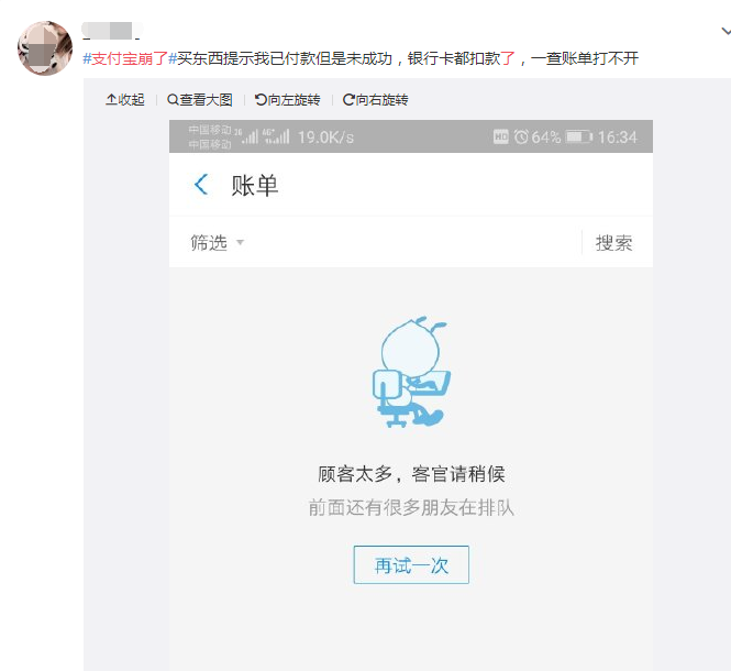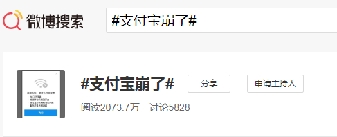 今天,支付宝崩了 小百 • 2021-08-14 支付图文 今天下午,突然大量网友反馈,支付宝崩了! 具体情况为部分用户出现已登录状态突然跳回原登录界面、无法支付转账等等操作,这一话题迅速冲上了微博热门讨论。 对于这次的事故,下午五点半左右,支付宝回应:支付宝的机房网络出现了短暂抖动,影响了部分用户的使用体验。一切已经恢复正常,大家的资金和信息安全不会受到影响哈。 合作/客服微信:baike2999 ▼进群加微信:baike2888 点击下方卡片关注支付百科 编辑:小百,转载请注明出处:https://www.paybaike.com/?p=5013 0 扫一扫,分享到微信 猜你喜欢 未央今日播报:“固收+”基金迎监管新规范 支付宝公布小微商家降费进展 金融数字化转型案例:基于可信执行环境的移动支付创新应用 未央今日播报:三部门发文规范网络直播营利行为 淘宝App内测微信支付