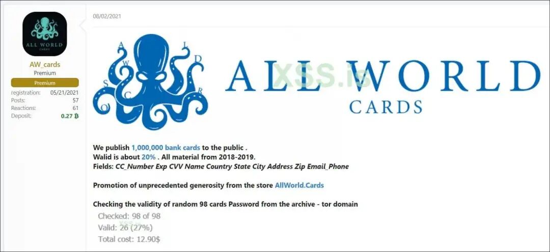 近日,全球威胁情报提供商Cycle公布消息,在一家名为AllWorld.Cards的网络犯罪网站上,有黑客泄露了超过100万张信用卡的信息,供大家免费盗用,有些信用卡目前还具备正常的支付功能。