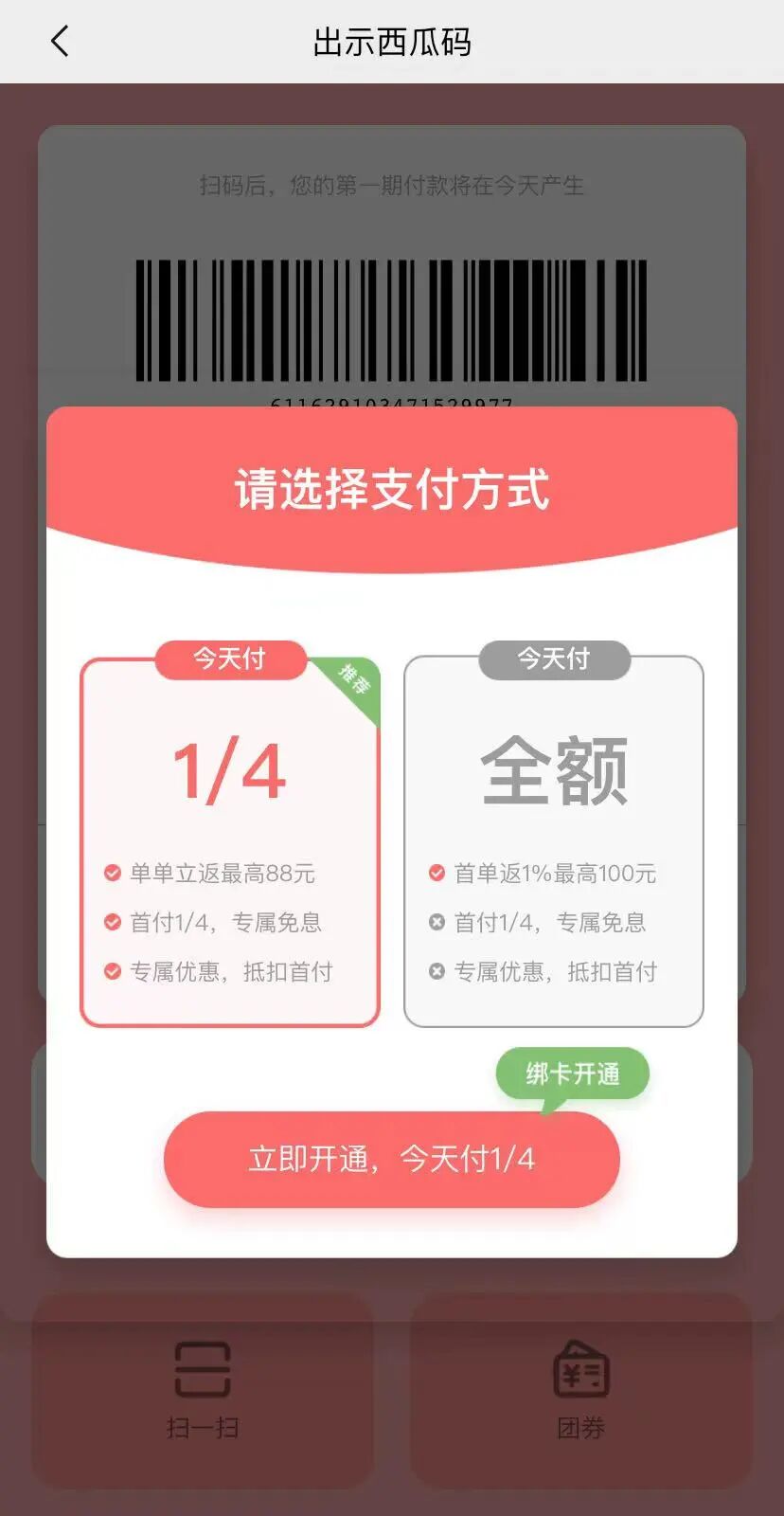 西瓜买单的使用场景主要依托合作的场景方,包括商场和品牌方。用户在签约品牌或签约商场付款时,可以出示西瓜买单付款码支付,其首付仅需消费金额的1/4,其余的3/4可在接下来的3个月内享受“0手续费、0利息”的分期支付。