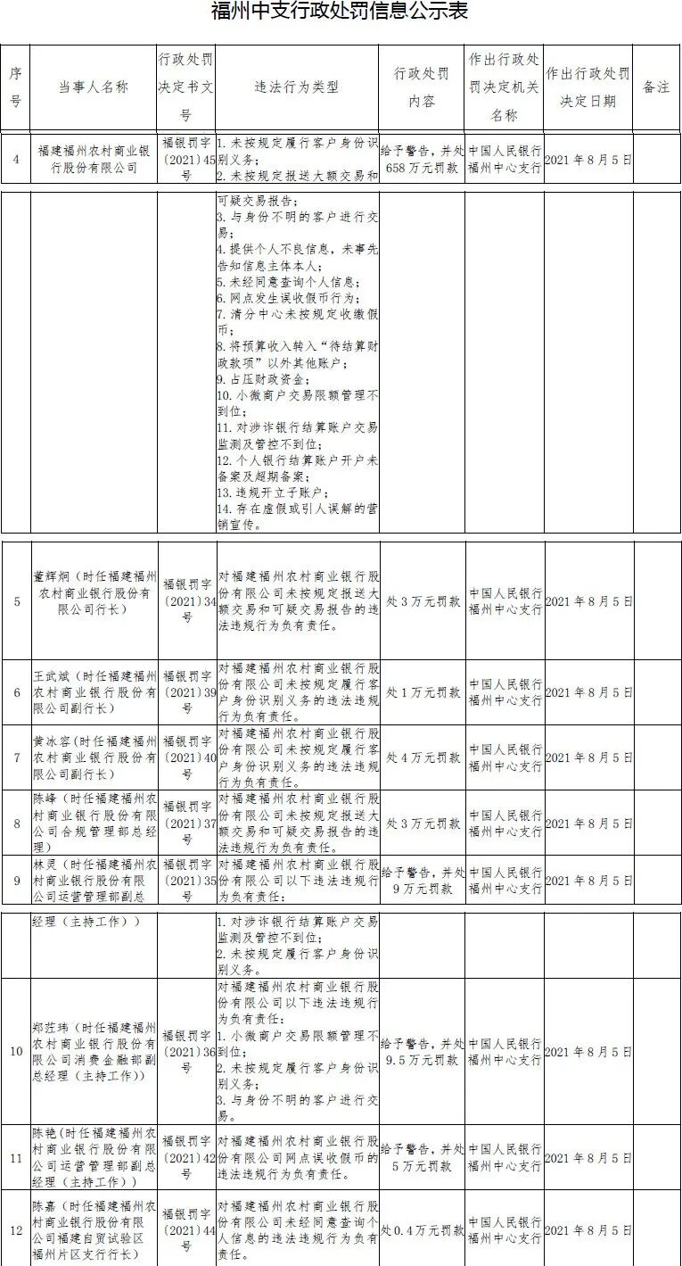 此外,时任福建福州农村商业银行消费金融部副总经理(主持工作)郑茳玮因对“小微商户交易限额管理不到位;未按规定履行客户身份识别义务;与身份不明的客户进行交易”三项行为负有责任被处以9.5万元罚款。时任福建福州农村商业银行运营管理部副总经理(主持工作)林灵被处以9万元罚款,具体违规案由为“对福建福州农村商业银行以下违法违规行为负有责任:对涉诈银行结算账户交易监测及管控不到位;未按规定履行客户身份识别义务。”时任福建福州农村商业银行行长董辉炯、合规管理部总经理陈峰因对“未按规定报送大额交易和可疑交易报告”两项行为负有责任,各被处以罚款3万元。其余5名相关责任人各被处以0.4万元—4万元不等的罚款。