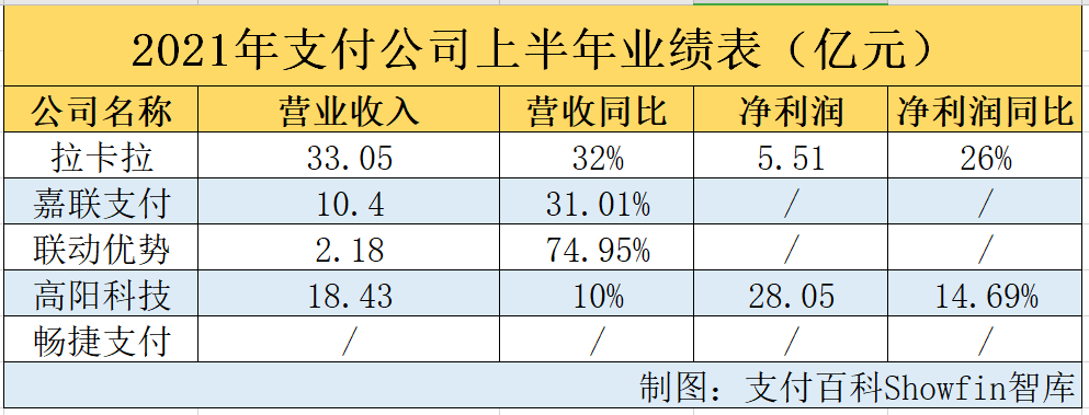 近日,拉卡拉、嘉联支付、联动优势、随行付、畅捷支付等多家支付公司披露了上半年的业绩情况,整体来看,5家支付公司上半年业绩均实现盈利状态。