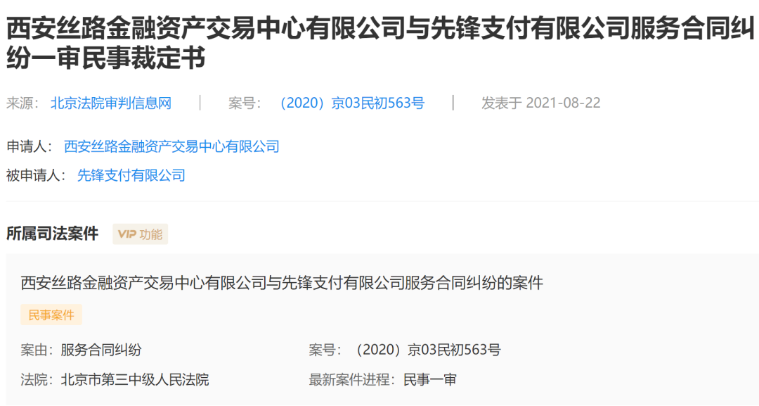 西安丝路金融资产交易中心有限公司与先锋支付有限公司服务合同纠纷一审民事裁定书显示,申请人西安丝路公司于2020年9月21日向法院申请财产保全,请求对被申请人先锋支付公司的合计一亿元财产进行保全。