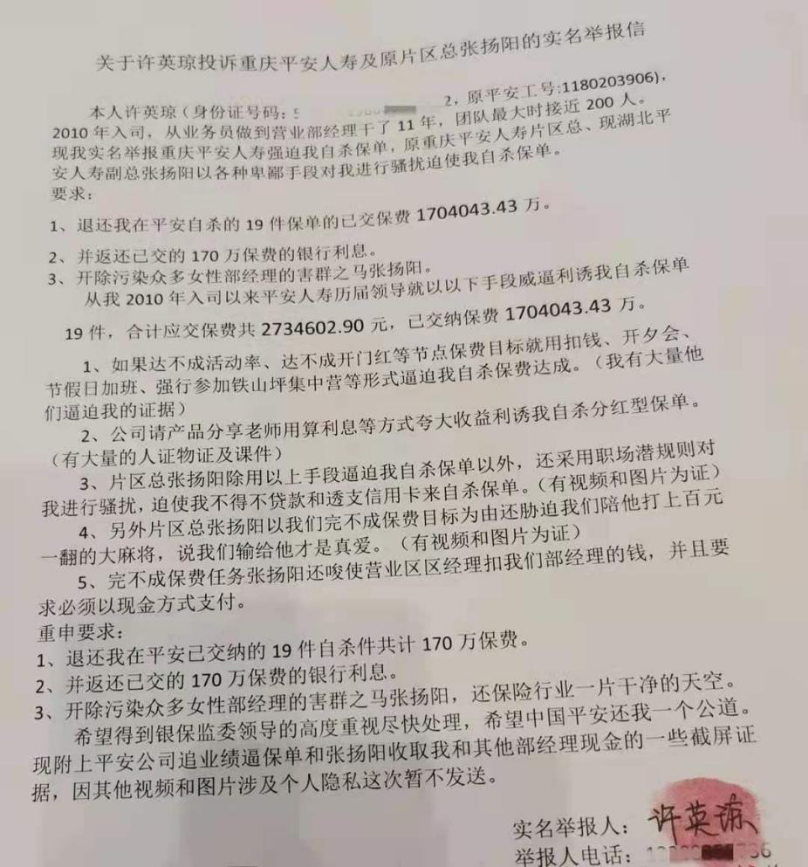 “平安人寿招的不是保险代理人,是客户。”最近,自称在平安人寿重庆分公司工作了11年的老员工许英琼,在自己的抖音账号实名举报,原公司重庆片区负责人张某阳逼迫其购买“自杀”保单,总共19件,合计273万元保单。