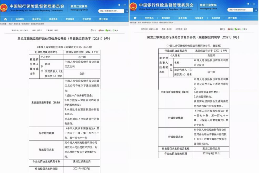 2月26日,黑龙江银保监局成立专项工作组,全面排查中国人寿黑龙江省辖内相关业务。4月28日,中国银保监会公布了调查结果显示,中国人寿嫩江支公司存在虚挂中介业务套取佣金、给予投保人保险合同约定以外的其他利益、未经批准变更营销服务部营业地址等违法违规行为,处罚款50万元;同时,中国人寿黑河分公司存在虚列佣金及虚列费用、内控管理缺失等违法违规行为,处罚款51万元并予以警告。