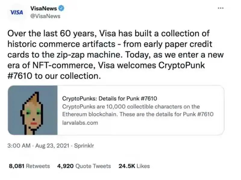 近日,美国支付巨头Visa在推特宣布,以约合15万美元的价格买下CryptoPunks系列的NFT,作品编号为7610。