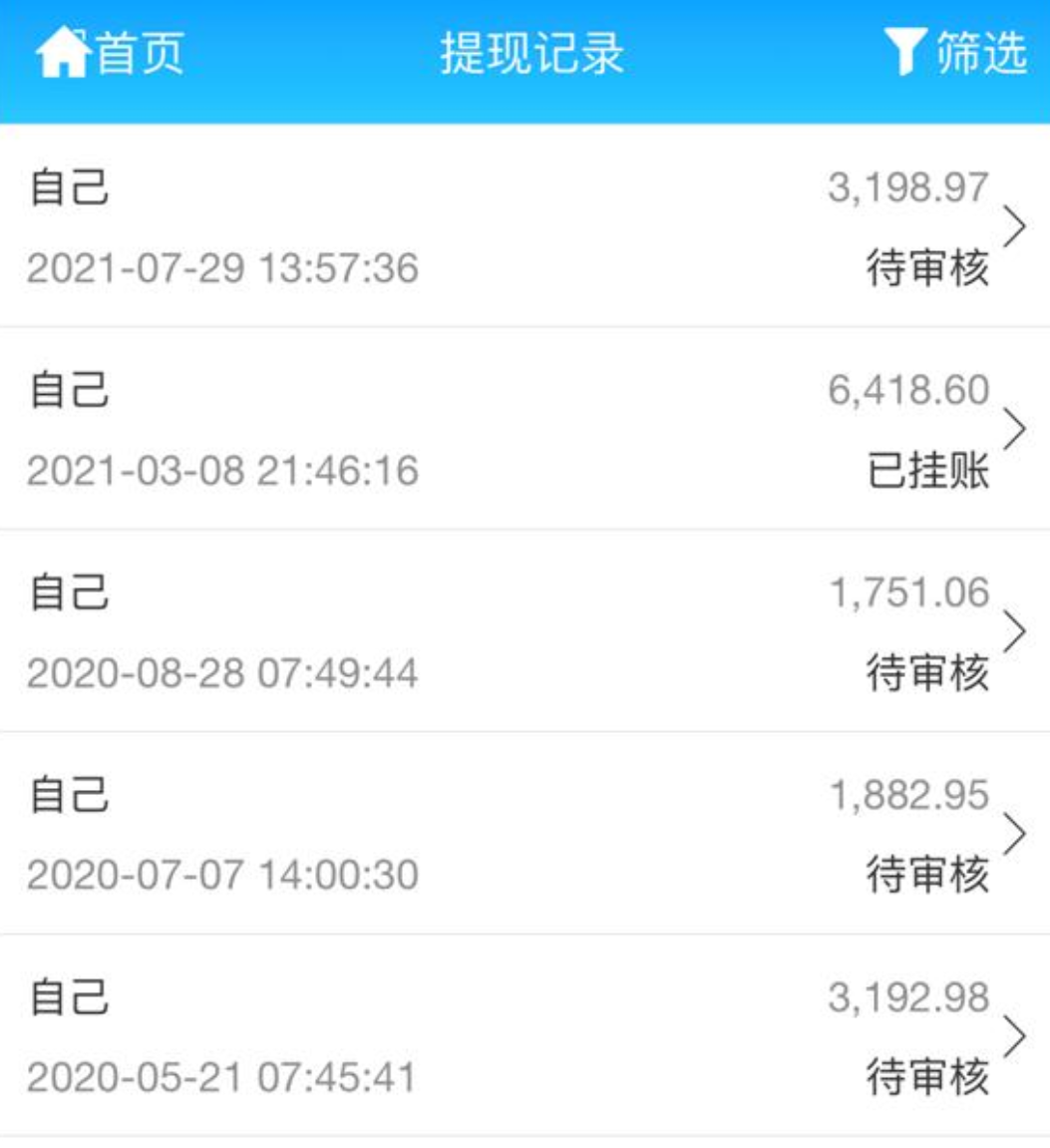 一名嘉联支付代理商的提现记录显示,其在2019年8月后多次尝试将分润提现,但结果均没有成功,提现申请长期处于待审核状态,至今没有将分润提现出来。