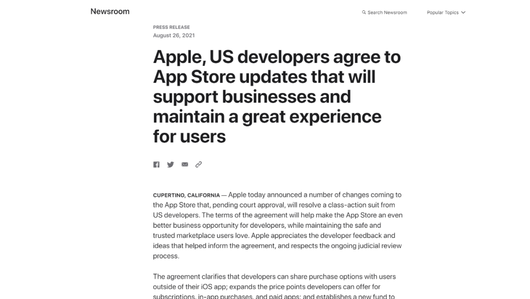 目前关于Apple与小型开发者的协议已经提交,还需要等待主审法官的通过批准,Apple和Epic Games之间的争议也正在审理之中。