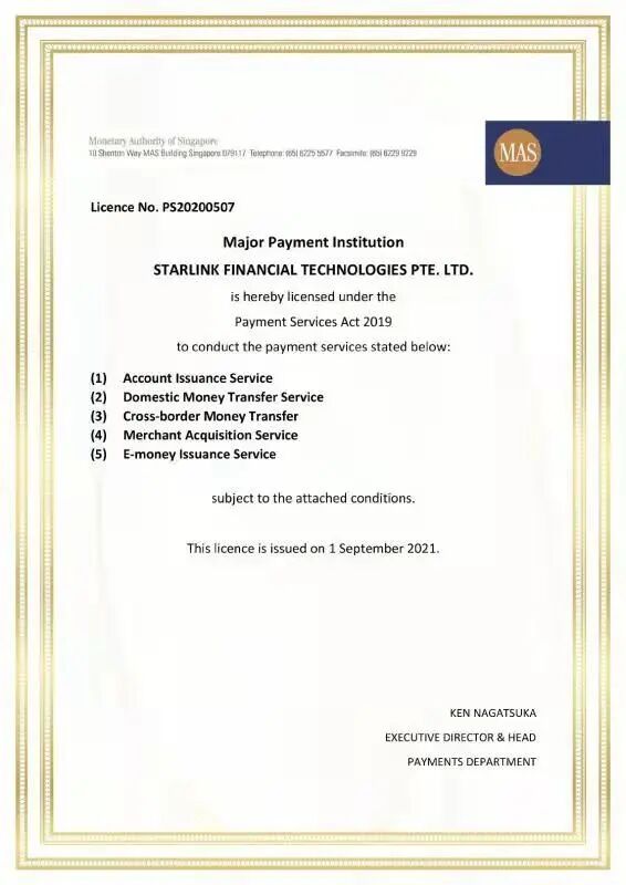 根据媒体资料,目前新加坡已审批的158家大型支付机构中,仅有9家企业获批5项及以上的业务资质,STARLINK便是其中之一。