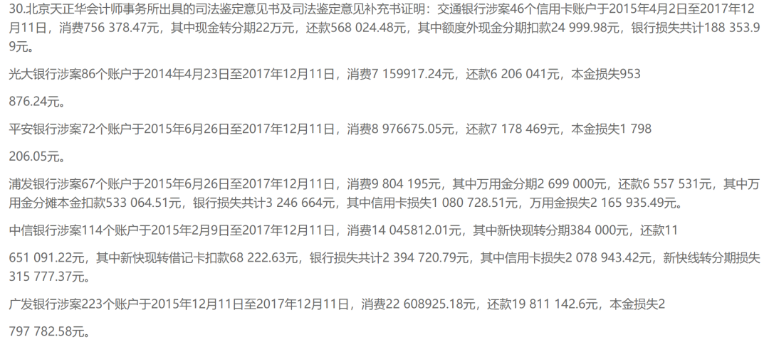 这些利用他人信息办理的700余张信用卡,在不断地透支套现以及以卡养卡的过程中,让银行遭受了严重的损失,交通银行损失共计18.8万元,光大银行本金损失95万元,平安银行本金损失180万元,浦发银行信用卡损失108万元,万用金损失216万元,中信银行损失共计239万元,广发银行本金损失279万元,6家银行损失超过1135万元。