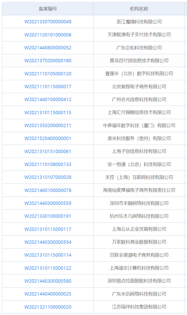 此前,包括收钱吧、利楚扫呗、易生支付、讯联数据、滴滴支付、银盈通支付(国美)、捷付睿通(小米)、快捷通(海尔)、国通星驿、智付电子支付、宝贝支付、杭州有云科技等机构均通过了聚合支付技术服务备案。