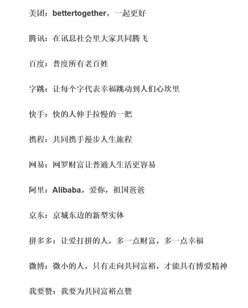 继美团58之后,支付公司们的新名词解释 小百 • 2021-09-06 支付图文 31家支付公司新名词解释出炉了,看看你还认的谁? 撰文 | 李雷 出品 | 支付百科 近日,在美团财报发布后的分析师会议上,美团CEO王兴对“共同富裕”进行了详解。他称共同富裕本身就植根于美团的基因中,美团的名字就有“一起更好”的意思,“因为‘美’就是better,‘团’就是together,美团就是一起更好”。 王兴的这条朋友圈刷遍朋友圈。 有趣的是,58同城创始人姚劲波也跟进“热圈”,表示58同城确实是来自:“我们一起发,共同富裕。主业也确实是为人民服务。” 看到互联网大佬们一个个表态了,网友们也按捺不住,纷纷下场,群策群力的为各大互联网巨头拟好了新的名词解释。 那支付行业里各大厂的名词新解,该怎么解释呢? 「支付百科」也给大家准备好了。 1.支付宝:让人人致富,才是真的宝 2.微信支付:相信帮助小微群体实现致富之路 3.平安壹钱包:为人民的每壹个钱包保平安 4.京东东付:京城东边不负众望的新型致富实体 5.瑞银信:瑞雪兆丰年,银银有信仰(东北味) 6.通联:打通不同阶层的亲密联结 7.银商:银们撸起袖子一起上(东北味) 8.拉卡拉:与群众手拉手唱卡拉OK 9.银盛:祖国繁荣昌盛 人民不缺银子 10.海科融通:大海的胸襟 科技的思维 融会贯通 11.付临门:让财富临门每一个家庭 12.畅捷:让社会更加通畅快捷 13.易宝:易起祝福拼搏奋斗的宝宝们 14.乐刷:好生活,快乐的洗刷刷 15.国通:和谐的国民思想 无师自通 16.杉德:人人有道德 就是金杉银杉 17.易生:让每一个家庭生三胎更容易 18.富友:让国人更富有 19.中付:让中国人更富有 20.中金:在群众中做好金融服务 21.网易宝:网罗财富让宝贝们生活更容易 22.钱宝:让普通人变有钱的法宝 23.新生:为祖国诞生更多的新生儿而奋斗 24.瑞祥:共同富裕,让祥瑞洒满人间 25.资和信:和平年代,相信兜里有资产才是硬道理 26.腾付通:国家腾飞 人民富有 事事顺通 27.随行付:群众走到哪都能富 28.翼支付:给予致富的翅膀,在财富的天空中自由飞翔 29.传化支付:传承中华文化,化成靓丽彩虹(右边再画个龙) 30.连连银通:让所有人的钱包四通八达 31.度小满:这个真想不出来,你们给想想? 还有哪些支付公司可以“主旋律”的解读,欢迎评论里添加! 合作/客服微信:baike2999 ▼进群加微信:baike2777 点击下方卡片关注支付百科 编辑:小百,转载请注明出处:https://www.paybaike.com/?p=5168 0 扫一扫,分享到微信 猜你喜欢 未央今日播报:“固收+”基金迎监管新规范 支付宝公布小微商家降费进展 银行个人支付的出路在哪里? 支付宝、微信、百度的小程序新逻辑