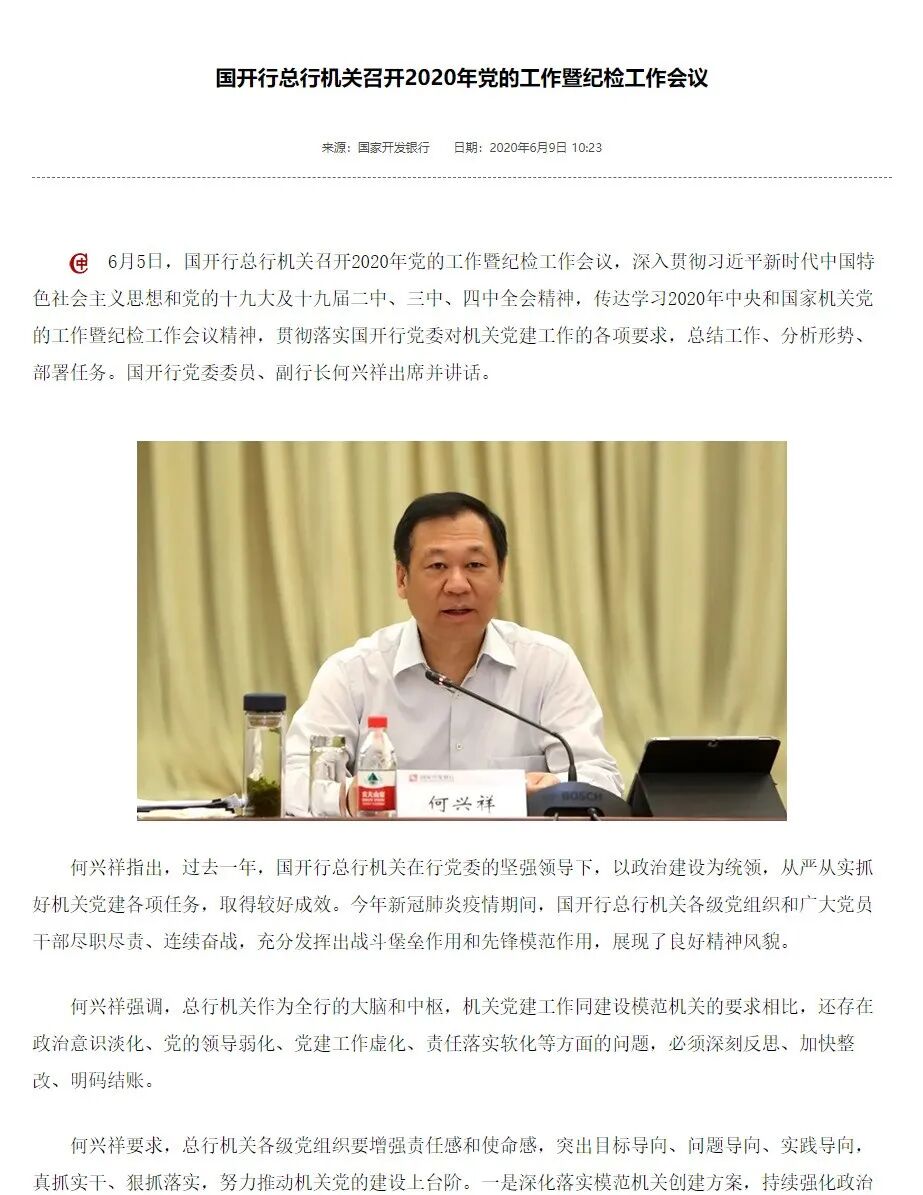 讽刺的是,作为国开行里被挖出来的第3只大老虎,去年6月5日,在国开行总行机关召开2020年党的工作暨纪检工作会议,何兴祥还出席并讲话,会上何兴祥提到要稳步推进强化党员干部理论武装、增强支部组织力、营造风清气正的政治生态等重点工作,以点带面、抓纲带目,推动机关党建工作水平全面提升。