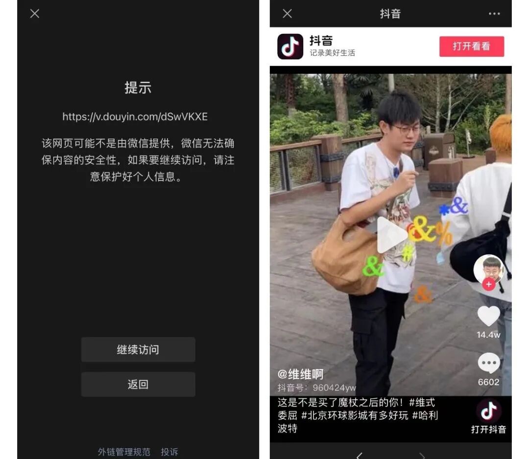 据一些媒体报道,一些用户已经可以打开抖音分享到微信的外链但访问流程中还会加上一句提示,告知微信无法确保内容和外部链接安全性。可见微信目前仅有部分用户开通了外链。