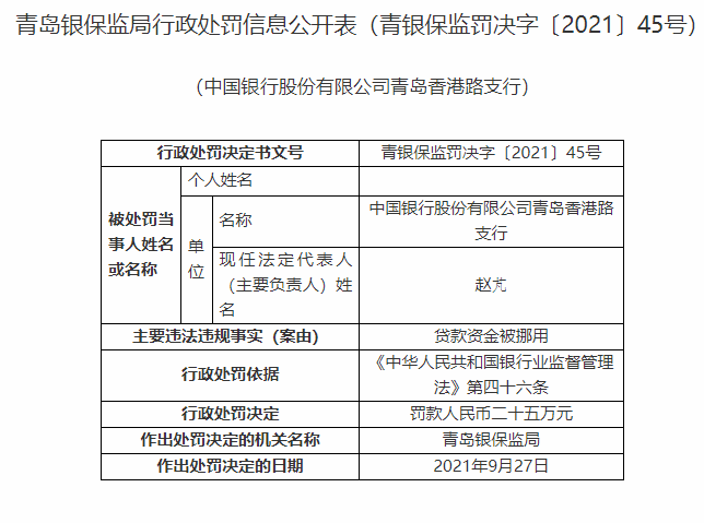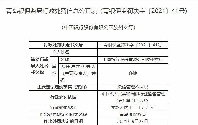 中国银行三家支行被处罚! 小百 • 2021-10-11 支付图文 日前,中国银保监会官网更新多则处罚公告。其中,中国银行三家支行各领到一张罚单。 中国银行胶州支行因授信管理不尽职,被罚款人民币二十五万元。耿烨对上述违规承担责任,被予以警告处罚。 中国银行青岛李沧支行因贷款审查严重不尽职,被罚款人民币二十五万元。刘春雨对上述违规承担责任,被予以警告处罚。 中国银行股份有限公司青岛香港路支行因贷款资金被挪用,被罚款人民币二十五万元。刘岩对上述违规承担责任,被予以警告处罚。 合作/客服微信:baike2999 ▼进群加微信:baike2777 点击下方卡片关注支付百科 编辑:小百,转载请注明出处:https://www.paybaike.com/?p=5285 0 扫一扫,分享到微信 猜你喜欢 未央今日播报:“固收+”基金迎监管新规范 支付宝公布小微商家降费进展 银行个人支付的出路在哪里? 支付宝、微信、百度的小程序新逻辑
