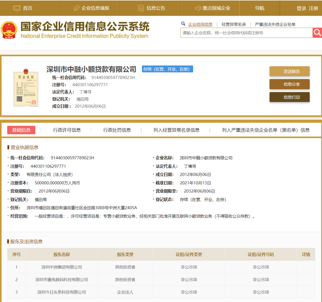 近日,深圳市中融小额贷款有限公司(下称“中融小贷”)工商信息发生变更,从原来的两位股东增加一位,除深圳中洲集团有限公司和深圳市赛兔数码科技有限公司外,增加了深圳今日头条科技有限公司。