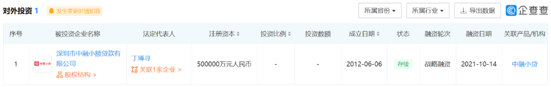 根据企查查内容,在今日头条对外投资一栏显示,其于2021年10月14日对中融小贷进行了战略融资,侧面也印证了这一点。