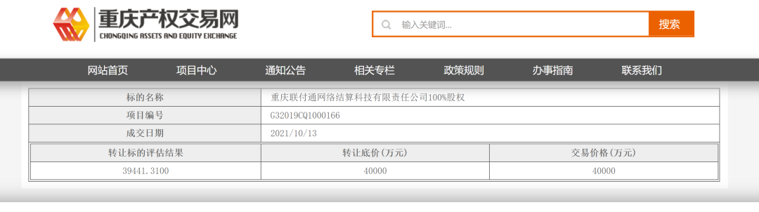 公告显示,重庆联付通网络结算科技有限责任公司100%股权在2021年10月13日已经成交,转让底价为40000万元,最终交易价格同样为40000万元,据支付产业网透露,这张互联网支付牌照的买家为中国人民财产保险股份有限公司。