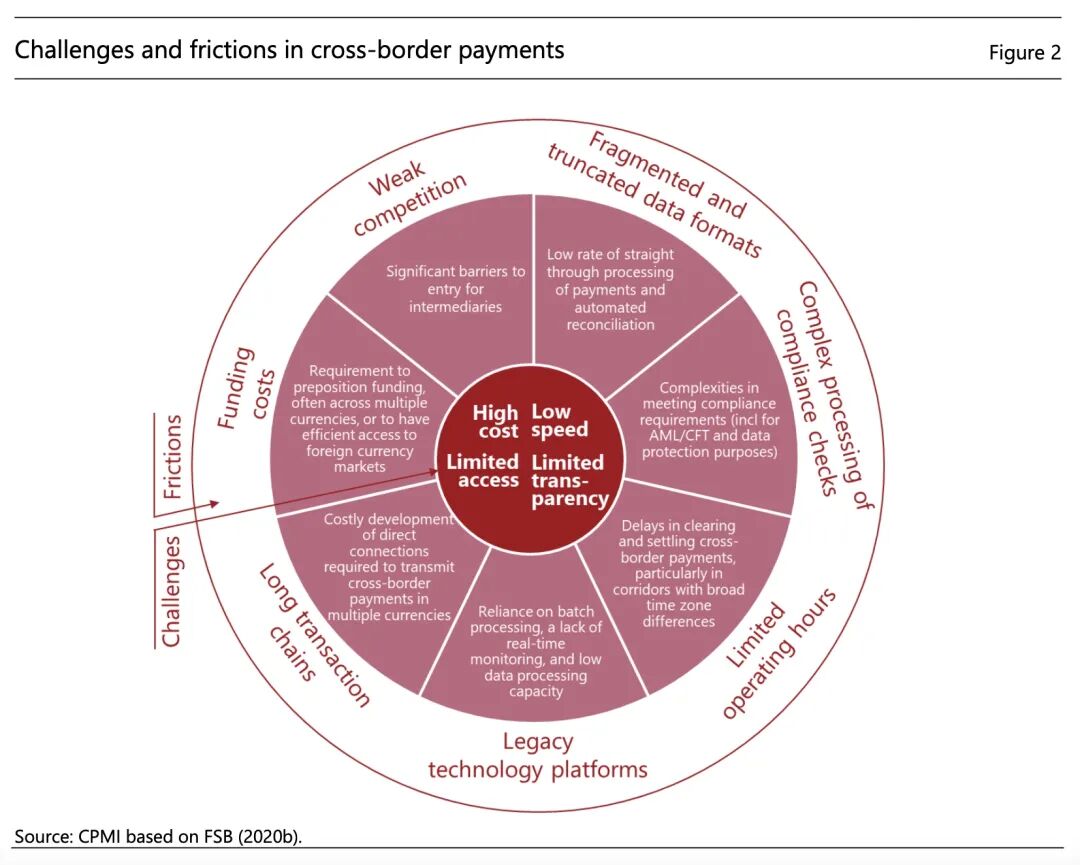 类似上面这些,反正提了一堆比较宽泛的问题和可能的探索方向。顺着这个思路,三个月后,BIS 的 CPMI 交出了一份答卷 —— 《Enhancing Cross-Border Payments: Building Blocks of A Global Roadmap》。 这份报告信息量和质量就非常高了。首先,非常清晰的给出了目前跨境支付存在的问题,也就是病灶在哪里,如下图所示: 跨境支付表现出来的「症状」是: