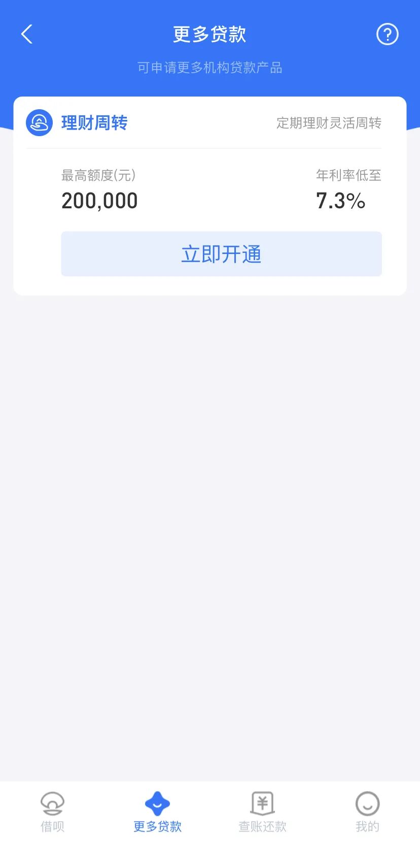 在借呗更多贷款功能中,目前只上线了一款理财周转产品。该产品是此前借呗与支付宝理财合作的一款消费贷产品,可以看作为理财用户的专享额度,最高额度20万元,按日计息,日息0.02%。