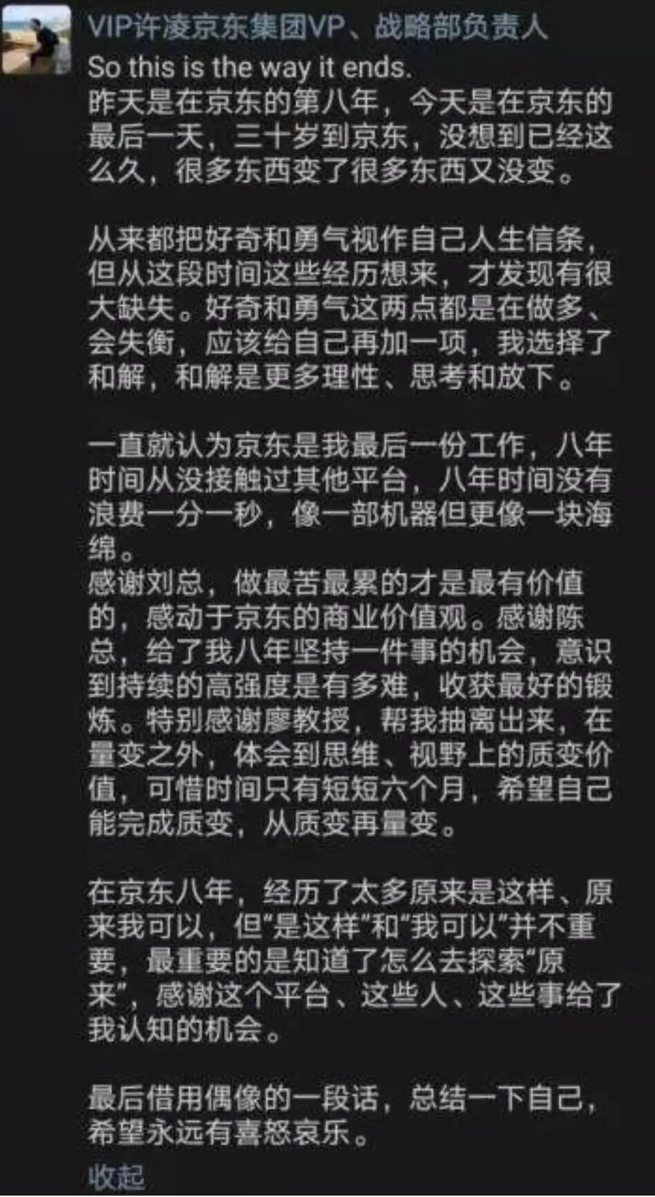 许凌被许多人认识是从白条开始,白条开启了互联网机构的信用支付之路,之后阿里也推出了花呗,从消费金融到支付,许凌在京东金融中发挥了关键的作用,但从发文中也能看出,许凌在京东的后半段时间过得并不如意。