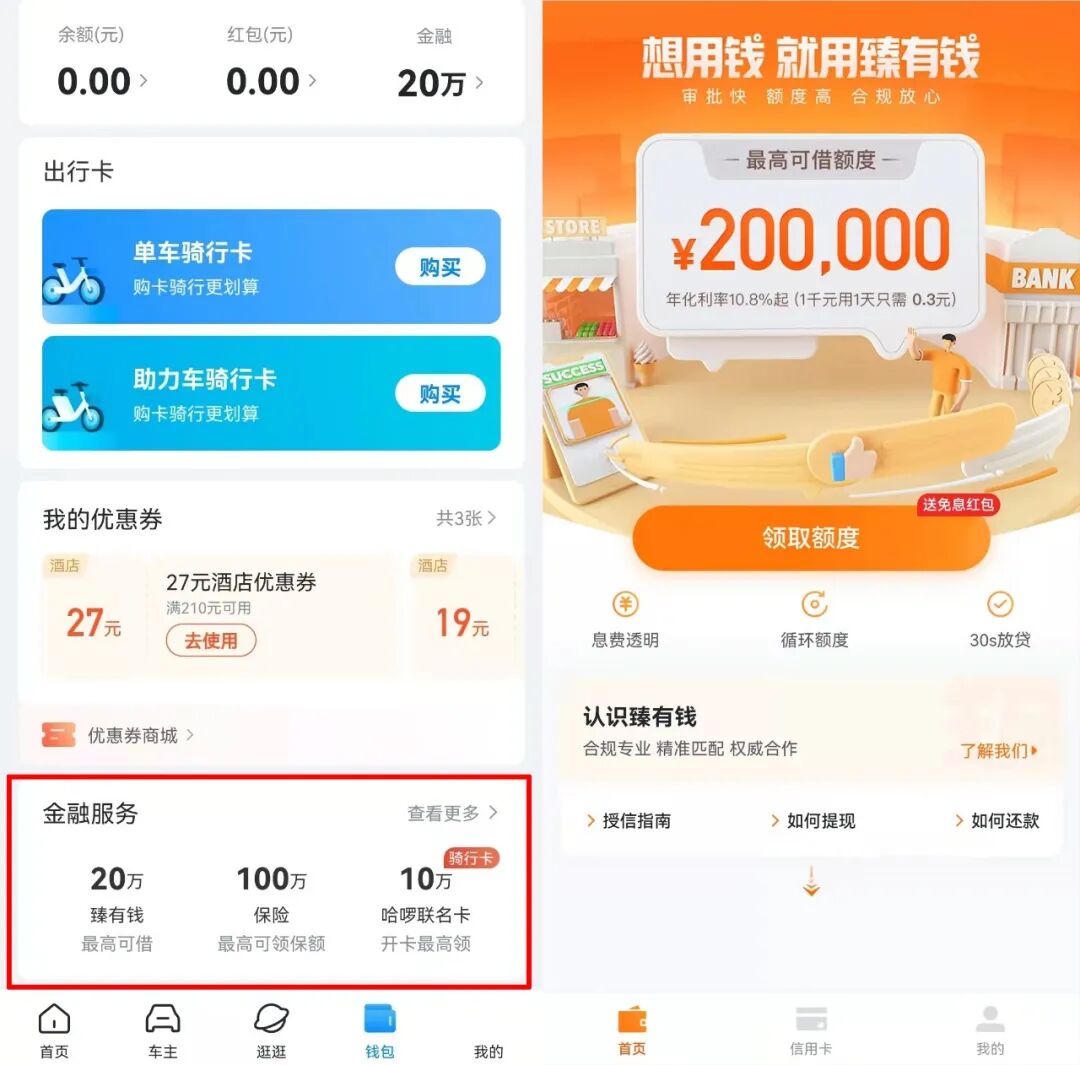 目前,哈啰在消费金融、保险、联名信用卡等金融业务上皆有布局,曾推出助贷产品“臻有钱”,最高20万额度,与湖北消费金融、中原消费金融等合作。背靠蚂蚁金服,尽管哈啰具备一定消费金融线上运营经验,助贷业务也并非一帆风顺。“臻有钱”曾被爆出贷后合同消失、利率过高、暴力催收等问题。