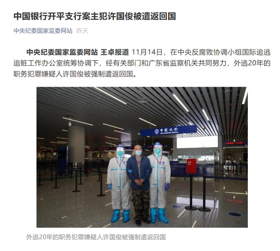 11月14日中央纪委国家监委网站消息,“开平案”最后一位主犯许国俊被强制遣返回国。至此,我国最大银行贪污案历时20多年全部犯罪人员均已归案。