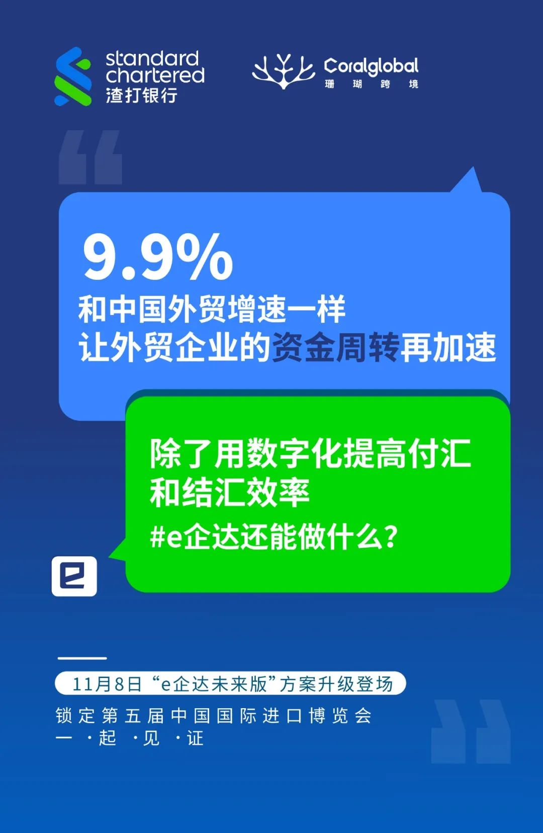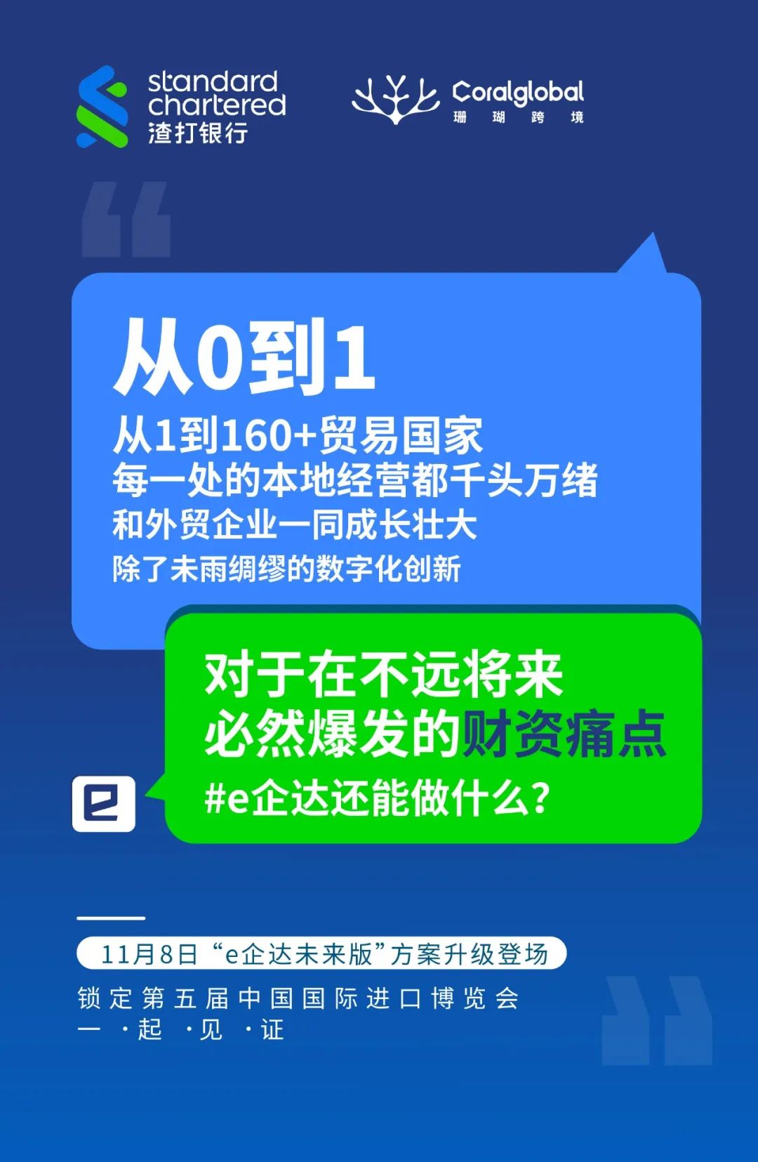 历时五年,进博会已成为全球新品和前沿技术的首发地,更是创新服务首推地。11月8日,CoralGlobal珊瑚跨境(以下简称珊瑚跨境)与渣打银行(中国)有限公司(以下简称渣打中国)携手亮相第五届中国国际进口博览会,现场双方领导出席“e企达·未来版”升级发布仪式,并举行了以“科技赋能数字贸易 金融助力e企同行”为主题的圆桌论坛,汇集客户代表与业内专家共论跨境贸易中的痛点与破局思路。