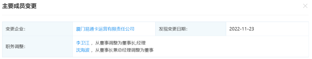 企查查显示,厦门易通卡的法定代表人由从“沈海波”变更为“李卫江”同时李卫江的职务从董事调整为董事长兼经理,沈海波的职务则从董事长兼总经理调整为董事。