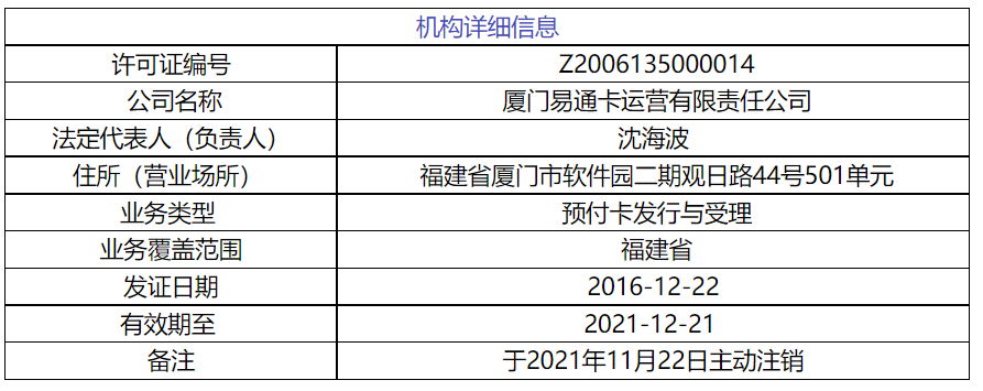 去年年底,厦门易通卡没有进行支付牌照的续展,支付牌照的有效期停留在了2021年12月21日,注销原因为厦门易通卡主动注销。