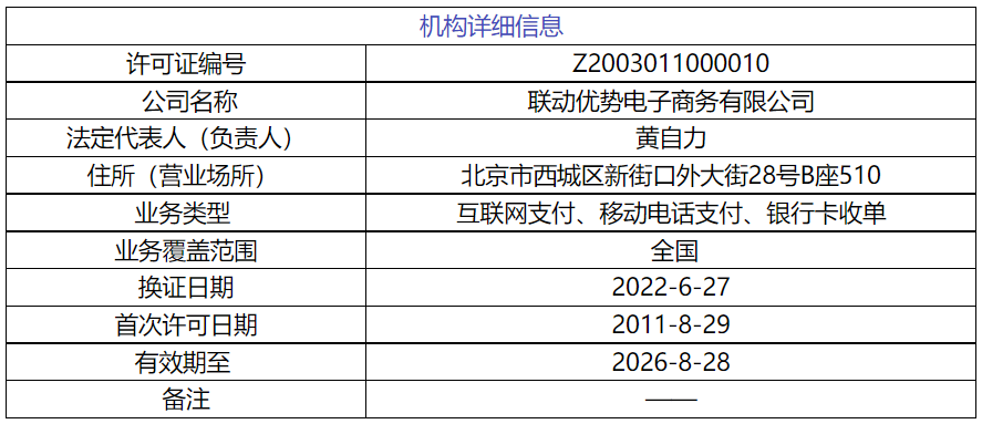 联动优势成立于2003年,是国内最早进入移动支付领域的企业之一。2011年8月获得央行颁发的支付业务许可证,在去年年底完成了支付牌照的续展,有效期至2026年。