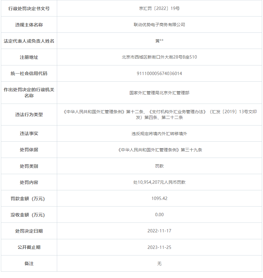 具体来看,联动优势的违法事实为违反规定将境内外汇转移境外,根据《中华人民共和国外汇管理条例》第三十九条,被国家外汇管理局北京外汇管理部处10954207元(1095万)人民币罚款。
