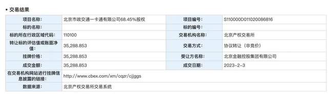 近日,北京市政交通一卡通有限公司(以下简称“北京一卡通”)68.45%股权转让成功,受让方为北京金融控股集团有限公司,最终成交金额为35288.853元(3.52亿元)。