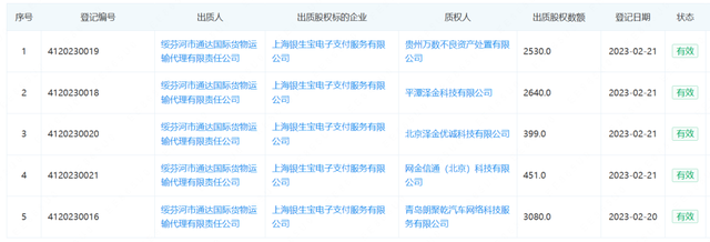 失去支付牌照庇护的银生宝,被持股82.72%的大股东绥芬河市通达国际货物运输代理有限责任公司将其持有的全部股权,合计出质股权数额9100万元人民币,与其在银生宝的认缴出资额相同,股权出质登记日期均为2023年2月21日。