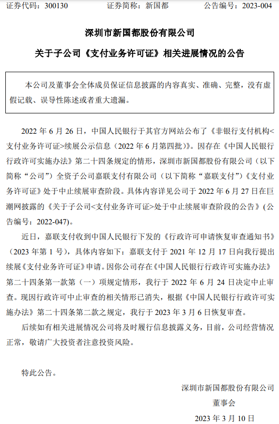 嘉联支付收到的央行下发的《行政许可申请恢复审查通知书》 (2023 年第 1 号)显示,现因行政许可中止审查的相关情形已消失,根据《中国人民银行行政许可实施办法》第二十四条第二款之规定,央行于2023年3月6日恢复审查。