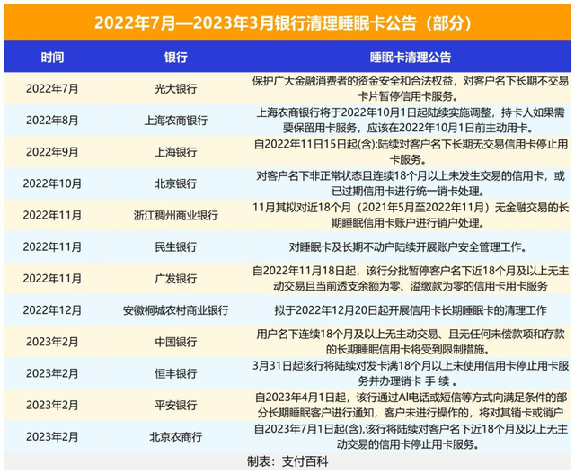 在「支付百科」整理出的数据中可以看出,多家银行均发布公告清理睡眠卡。