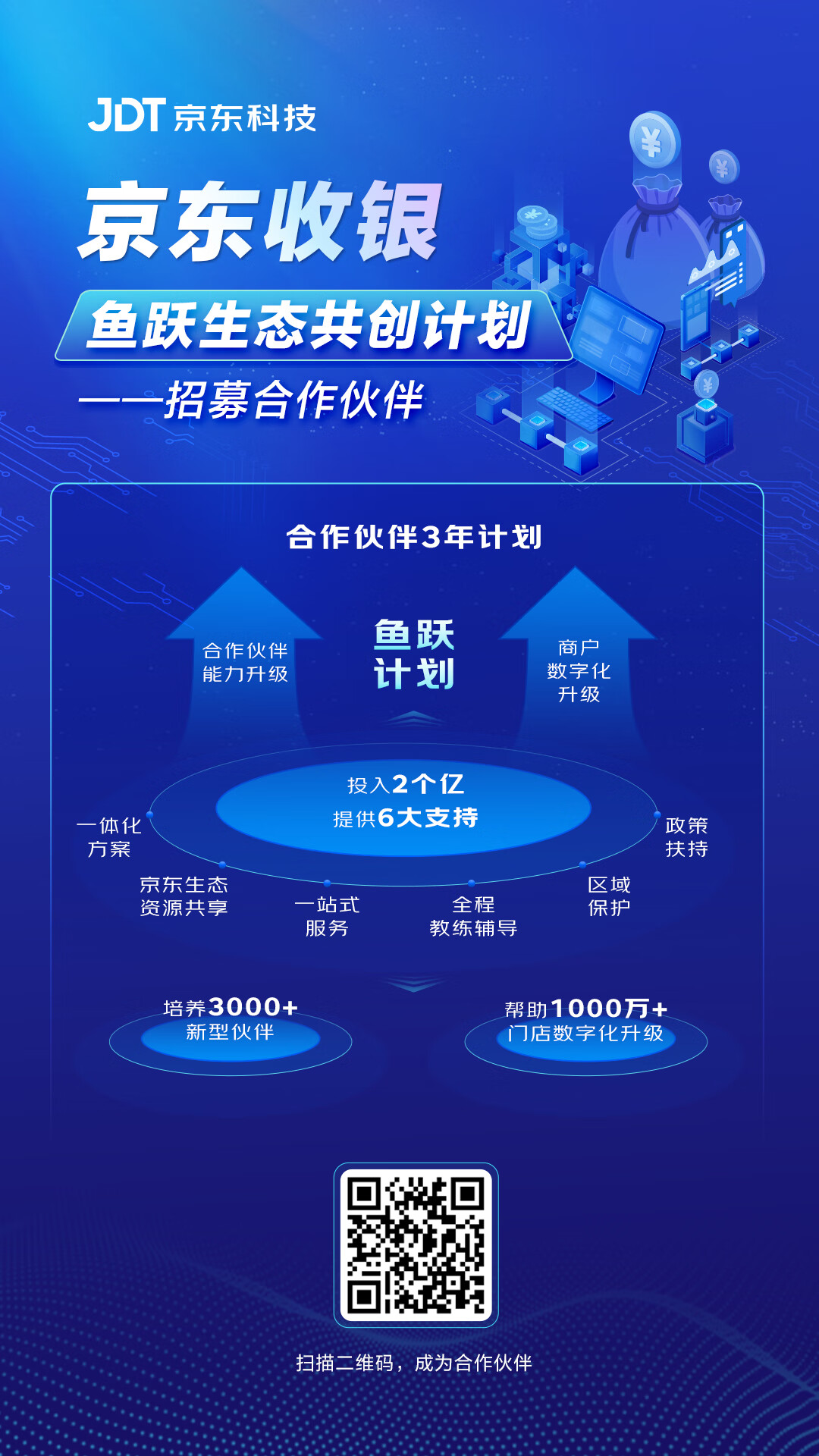 为了携手服务商伙伴更好地服务中小微商户和企业数字化升级,「支付百科」看到,京东收银发布了“鱼跃生态共创计划”: