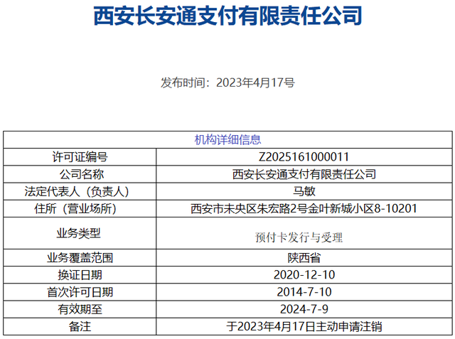 从央行公示的注销详情来看,西安长安通支付有限责任公司(以下简称“西安长安通支付”)于2023年4月17日主动申请注销,在2019年通过支付牌照的续展后,西安长安通支付的牌照有效期至2024年7月。