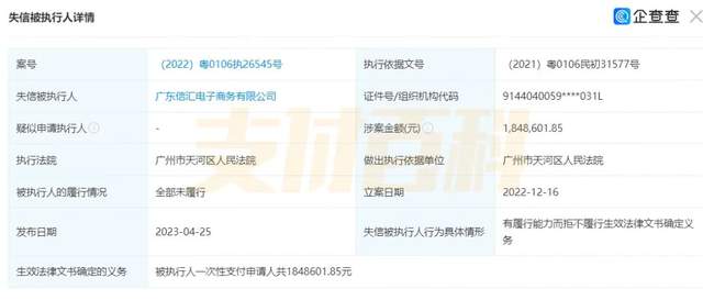 近日,「支付百科」发现了广东信汇电子商务有限公司(简称“广东信汇”)因为“有履行能力而拒不履行生效法律文书确定义务”被广州市天河区人民法院列为失信被执行人,应执行184.86万元,全部未履行。