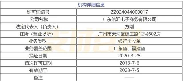 据了解,广东信汇于2012年成立,是一家在广东省、福建省从事银行卡收单业务的持牌支付机构,于2013年获得央行颁发的支付牌照,2023年7月5日到期。