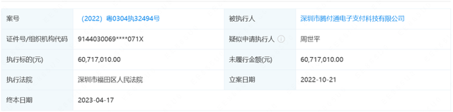 近日,深圳市腾付通电子支付科技有限公司(简称“腾付通”)被深圳市福田区人民法院执行未履行金额6071万,加上之前的一起终结案件,腾付通被广东省广州市中级人民法院执行4.72亿元未履行,合计赖账超过5.3亿元,并且还有多条限消令。