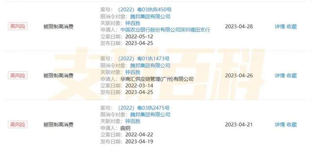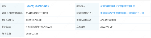 2022年9月29日,中国信达资产管理股份有限公司深圳市分公司(疑似申请人)曾向广东省深圳市中级人民法院申请执行腾付通4.729亿元,腾付通未履行,2023年2月23日被法院列为终本案件。