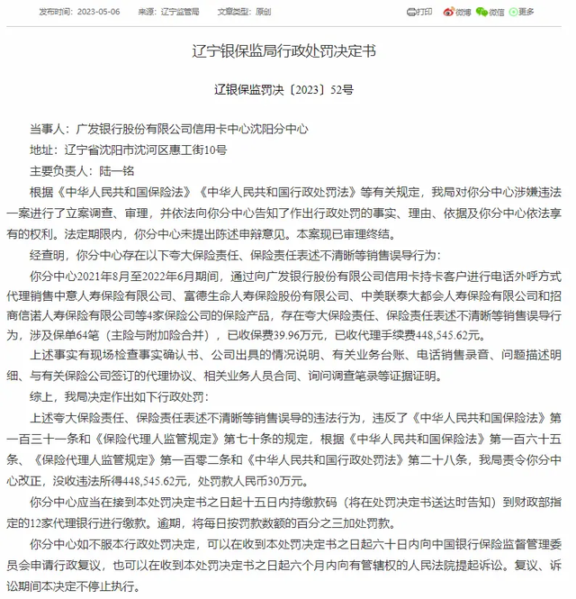 处罚决定书显示,广发信用卡中心通过向持卡人,进行电话外呼的方式销售其代理的4家保险公司的保险产品。违反了《中华人民共和国保险法》第一百三十一条和《保险代理人监管规定》第七十条的规定。辽阳银保监局责令整改,没收广发银行违法所得448.545.62元,处罚款人民币30万元。