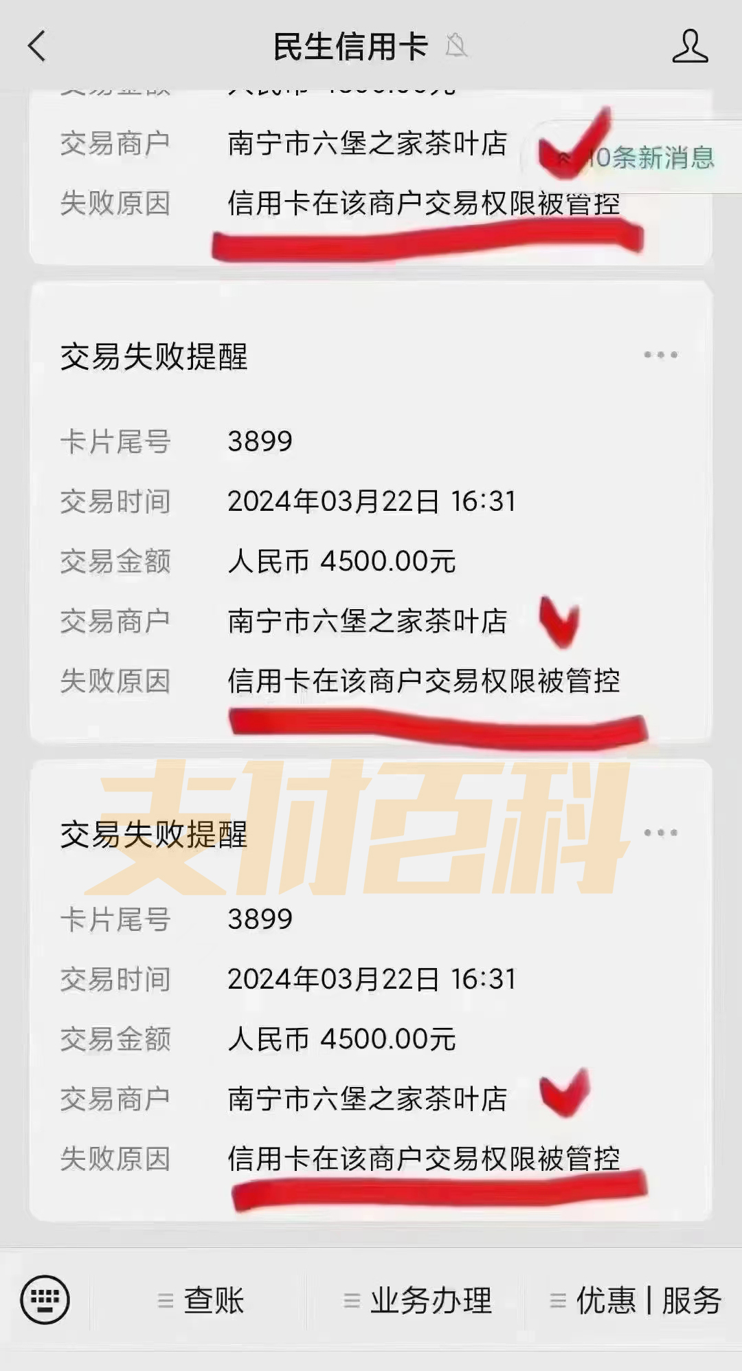 具体来看,河北省唐山市的某笔交易因信用卡在商户交易权限被管控交易失败,南宁市也有读者反映,因同样问题交易失败,大量民生银行信用卡持卡人都遇到了类似的情况。
